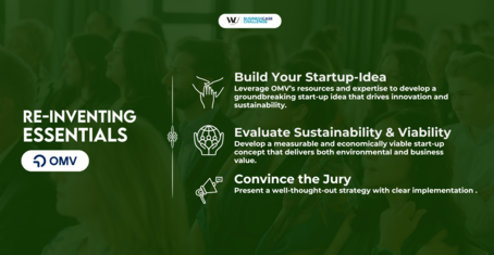 Für die diesjährige Challenge laden wir euch ein, eine Start-up-Idee zu entwickeln, die OMVs Expertise und Ressourcen nutzt, um nachhaltige Innovationen voranzutreiben. Eure Idee sollte sich an der OMV-Strategie 2030orientieren und sowohl Kundennutzen als auch einen ökologischen Mehrwert schaffen.