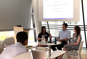 Drei Personen im Halbkreis und 1 Person aus dem Publikum