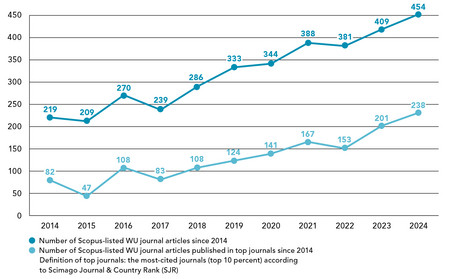 Number of Scopus-listed WU journal articles since 2014: 2014 - 219, 2015 - 209, 2016 - 270, 2017 - 239, 2018 - 286, 2019 - 333, 2020 - 344, 2021 - 388, 2022 - 381, 2023 - 409, 2024 - 454. Number of Scopus-listed WU journal articles published in top journals since 2014 (Definition of top journals: the most-cited journals (top 10 percent) according to Scimago Journal & Country Rank, SJR): 2014 - 82, 2015 - 47, 2016 - 108, 2017 - 83, 2018 - 108, 2019 - 124, 2020 - 141, 2021 - 167, 2022 - 153, 2023 - 201, 2024 - 238.