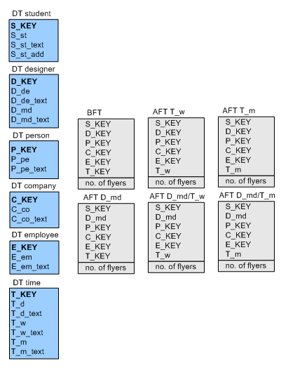 This case's Classic Star Schema has seven tables, a central fact table and six dimension tables. The latter consist of a generated key as well as a key and a text field for each hierarchy (except the total aggregation) and the level attribute. The fact table uses the generated keys from the dimension tables as a combined key and contains only one key figures in this example "no. of flyers":