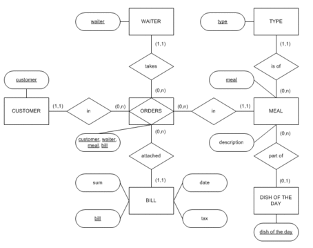 A customer orders a meal. The meal is of a certain type and can be part of the dish of the day. A waiter takes the order and a bill which contains the sum, the tax and the date of the order is attached. The time dimension consists of day, week and month.