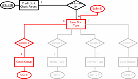 b) There are credit groups (CGr-#) for e.g. sales order, delivery and goods issue. A credit group can be assigned to several sales document types, whereas a sales document type can only be assigned to one credit group.