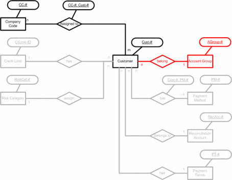 b) Customers are categorized in account groups. Whereby a customer belongs to one account group (AGroup-#) only; an account group may contain several customers.