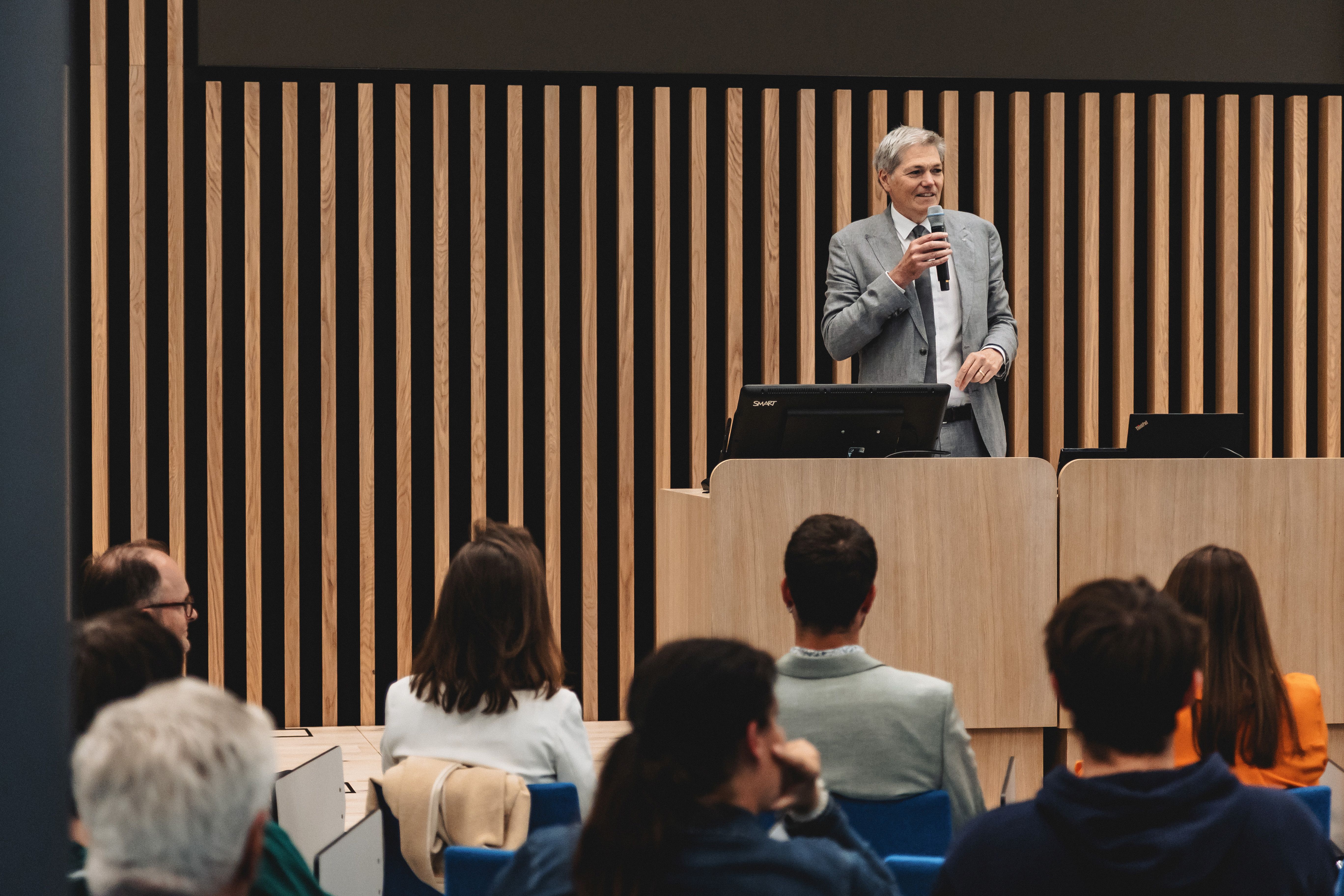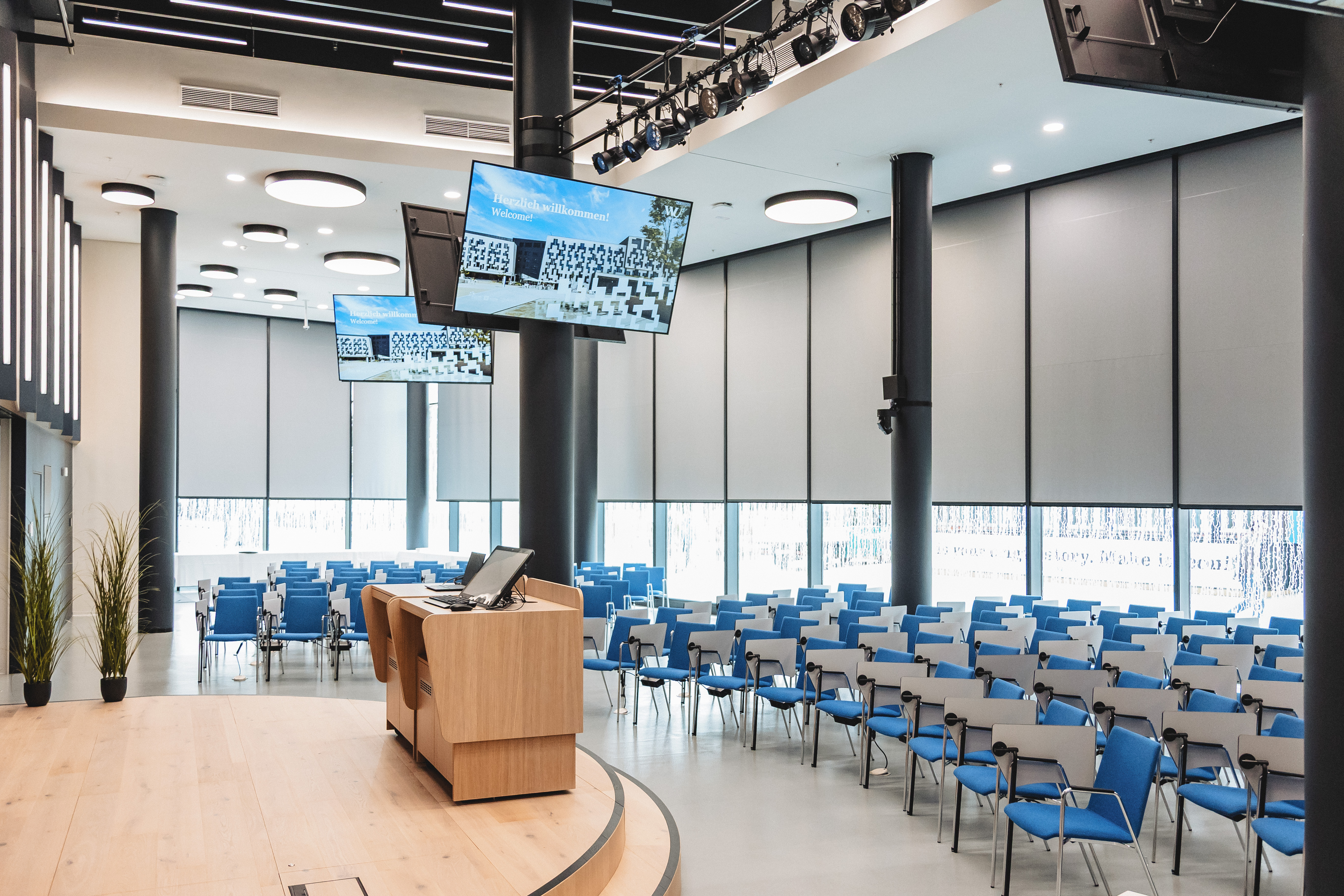 Mit dem neuen Raum wurde nun in kürzester Zeit ein funktional passender Hörsaal geschaffen, der gleichzeitig ein Ort des Diskurses und der Begegnung ist. Der Hörsaal ist multifunktional konzipiert und kann neben Lehrveranstaltungen auch für andere Formate genutzt werden, die Lehre bleibt aber die zentrale Aufgabe. Die Bühne ist abbaubar, es gibt Schiebewände, jeder Sitzplatz bietet ein großes Schreibpult sowie eine Steckdose und hat Sicht auf die Bühne oder auf einen der großen Bildschirme. „Beim Umbau zum neuen Hörsaal war es uns wichtig, schnell und ressourcenschonend eine Lösung zu schaffen, die Studierenden wie Lehrenden gleichermaßen zugutekommt. So stärken wir die Qualität von Studium und Lehre und investieren nachhaltig in die Zukunft unserer Universität“, betont WU-Rektor Rupert Sausgruber.