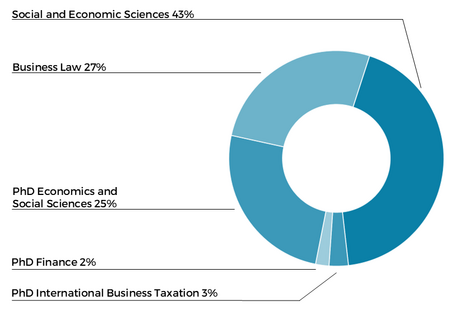 Verteilung der Doktorats-/PhD-Studierenden: 43% Sozial- und Wirtschaftswissenschaften, 25% PhD Wirtschafts- und Sozialwissenschaften, 27% Wirtschaftsrecht, 3% PhD International Business Taxation und 2% PhD Finance.