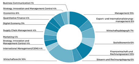 2024 studierten 343 (43%) der Doktoratsstudierenden Sozial- und Wirtschaftswissenschaften, 201 (25%) PhD Wirtschafts- und Sozialwissenschaften, 211 (27%) Wirtschaftsrecht, 23 (3%) PhD International Business Taxation und 16 (2%) PhD Finance.